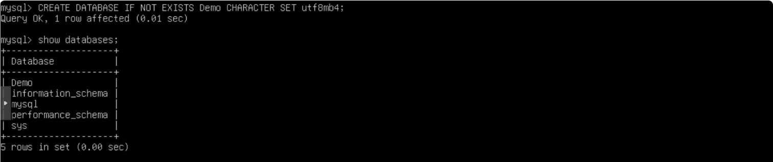 CREATE DATABASE IF NOT EXISTS Demo CHARACTER SET utf8mb4;