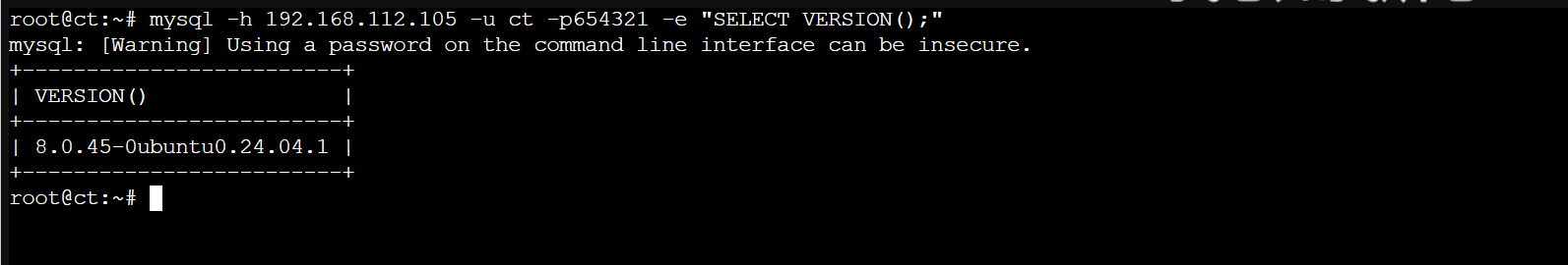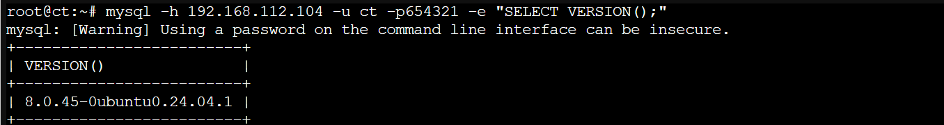 mysql -h 192.168.112.104 -uct -p654321 -e "SELECT VERSION();"返回结果。