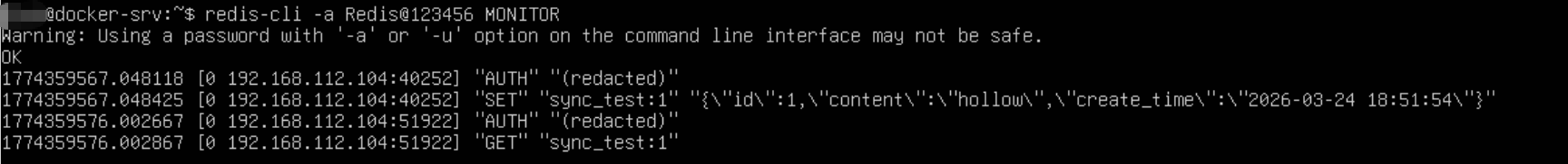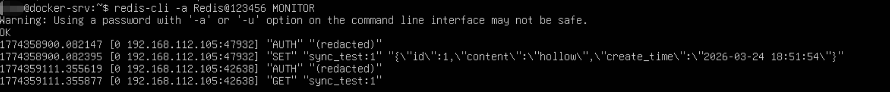 redis-cli -h 192.168.112.108 -a Redis@123456 GET sync_test:1