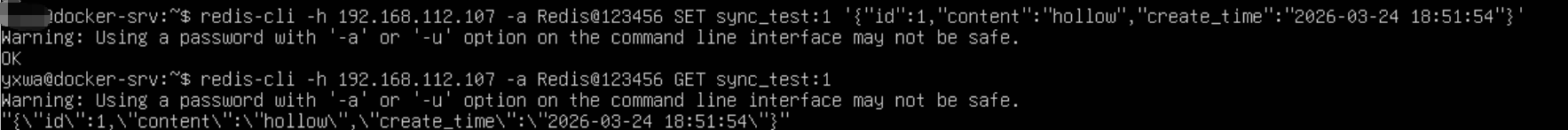 redis-cli -h 192.168.112.107 -a Redis@123456 SET sync_test:1 '{"id":1,"content":"hollow","create_time":"2026-03-24 18:51:54"}'