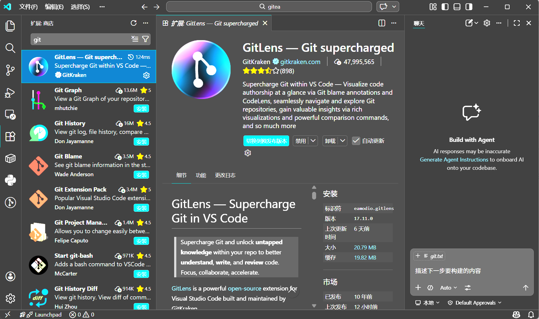 2.在VS Code中使用Git需先在拓展商店中安装Git插件