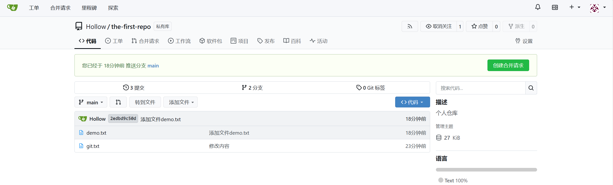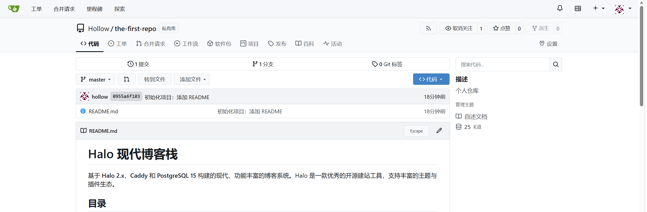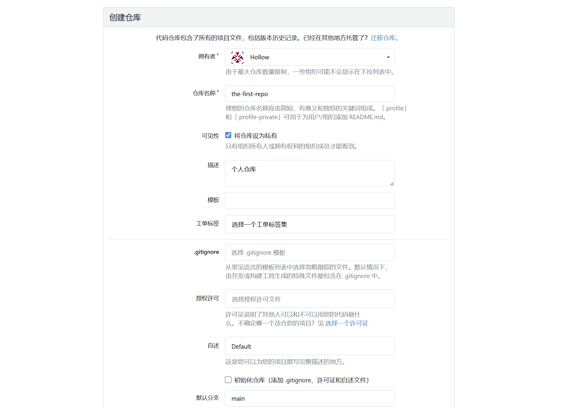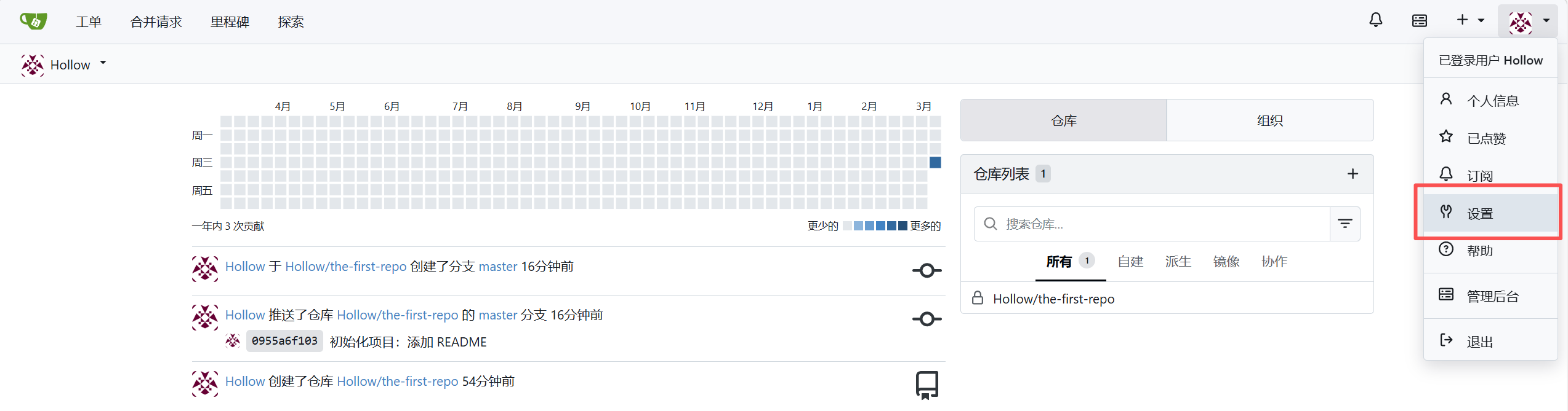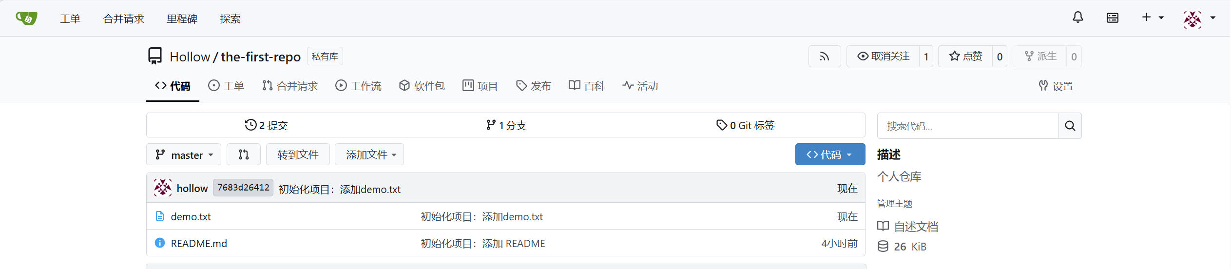 2. 在 Gitea 页面上创建一个名为 the-first-repo 的私有仓库。