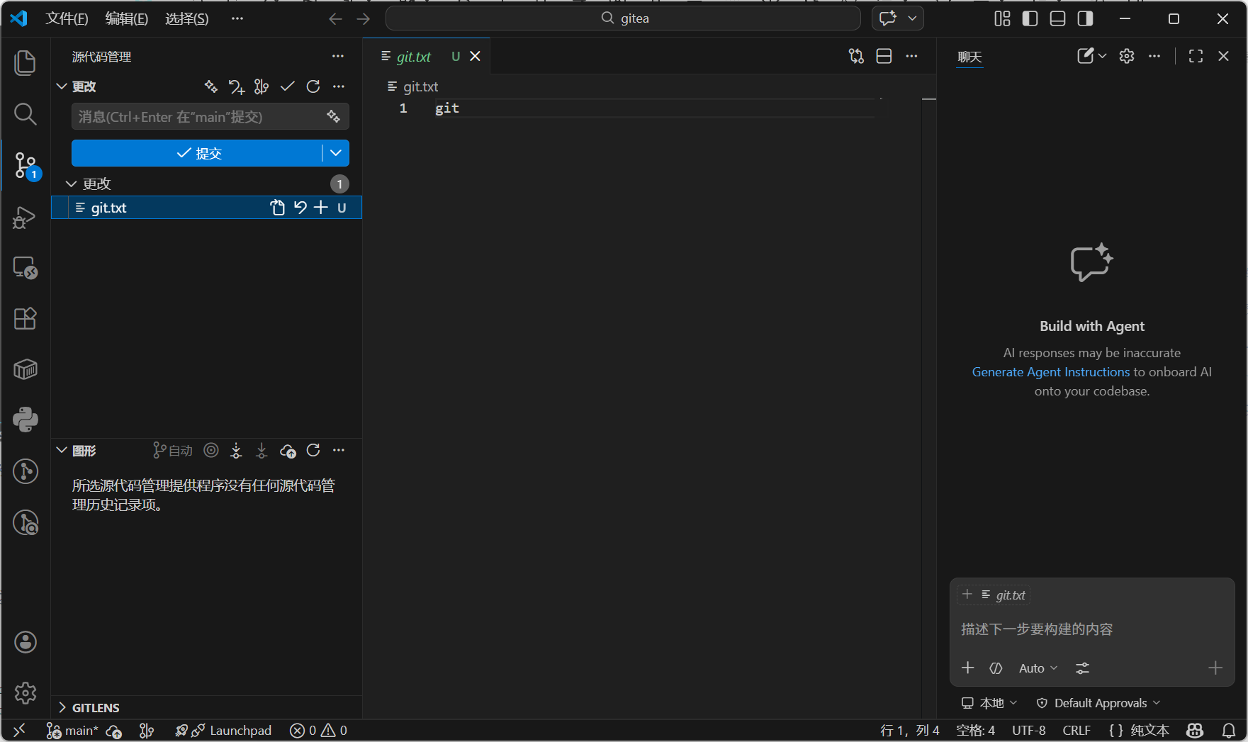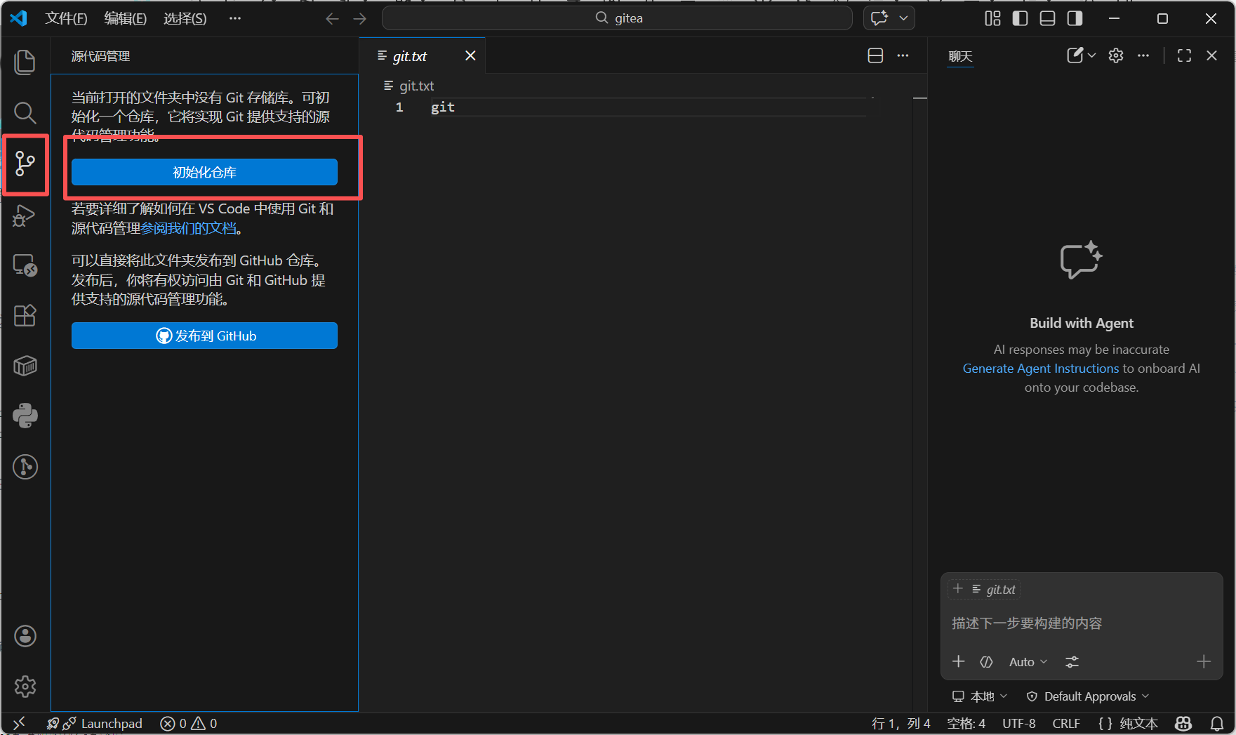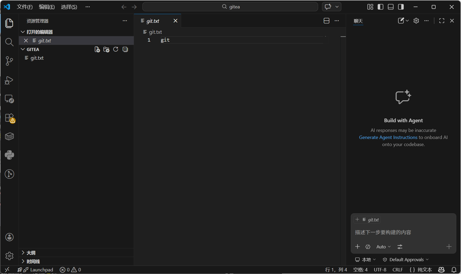 1.打开VS Code,打开新创建的目录gitea,并将创建好的git.txt拖入其中。