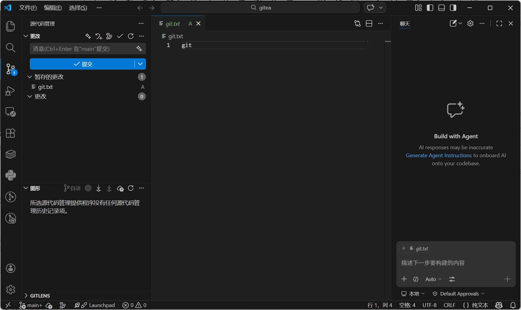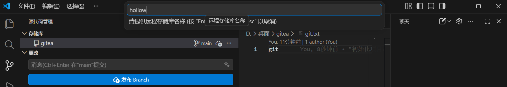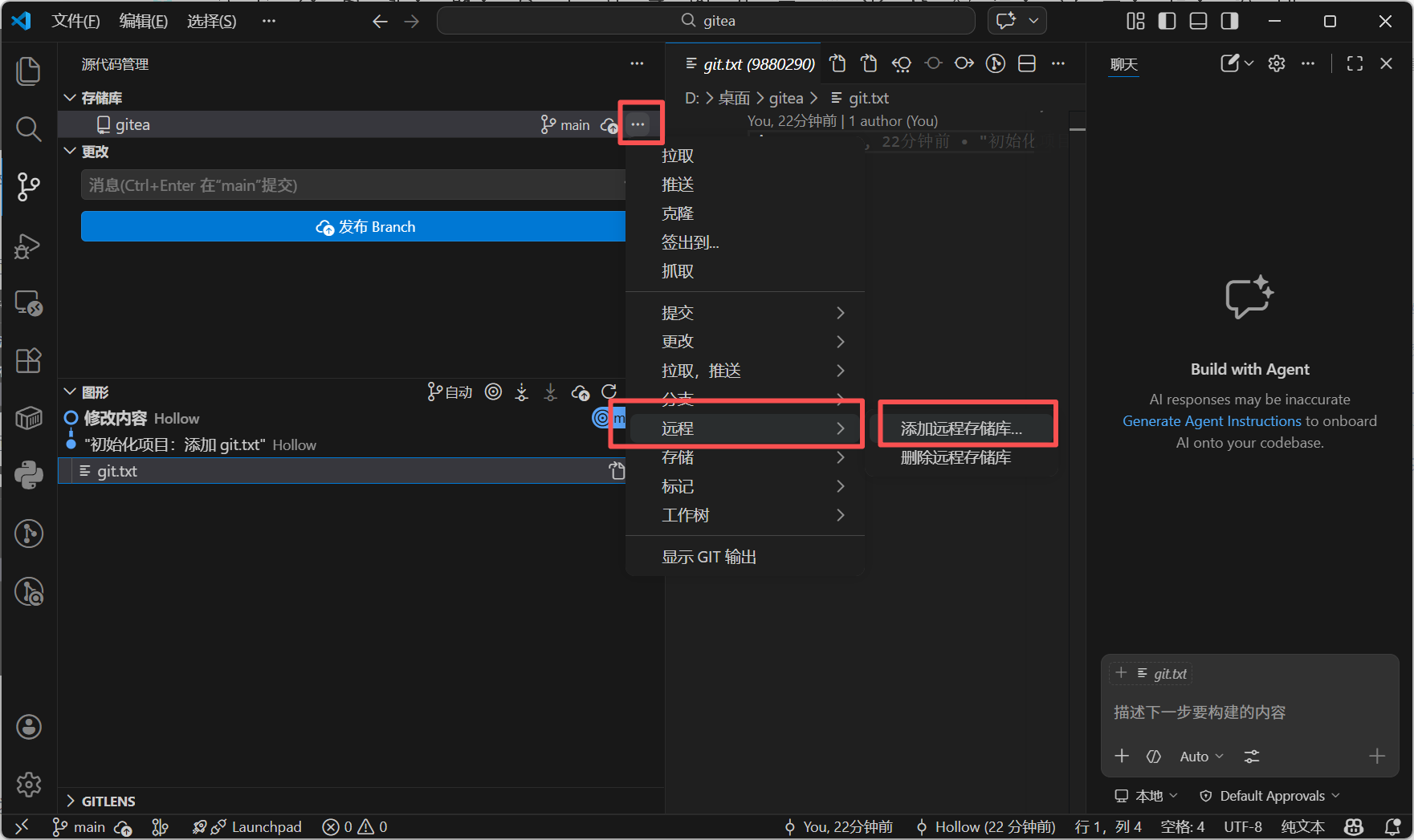1.打开VS Code,打开新创建的目录gitea,并将创建好的git.txt拖入其中。