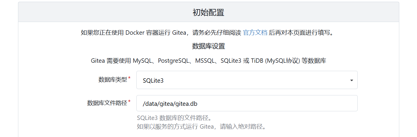 3. 通过宿主机的浏览器访问 http://<Ubuntu的IP地址>:3000,完成 Gitea 的初始安装向导设置(数据库可选择简单的 SQLite3 以降低配置难度)。