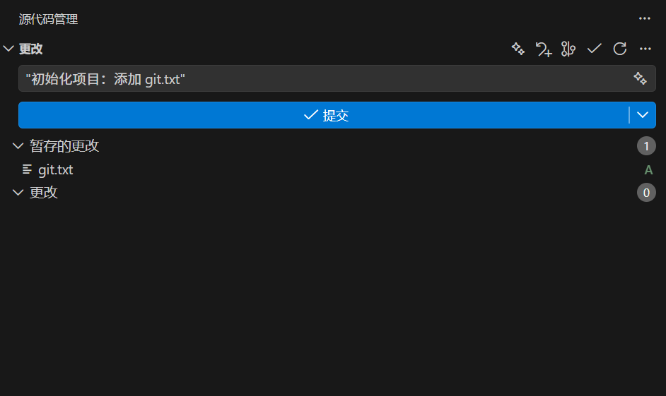 6.在上侧输入框中,输入提交备注 如:"初始化项目:添加 git.txt",输入完成后点击上方的√提交,提交更改,对应终端的 git commit -m命令