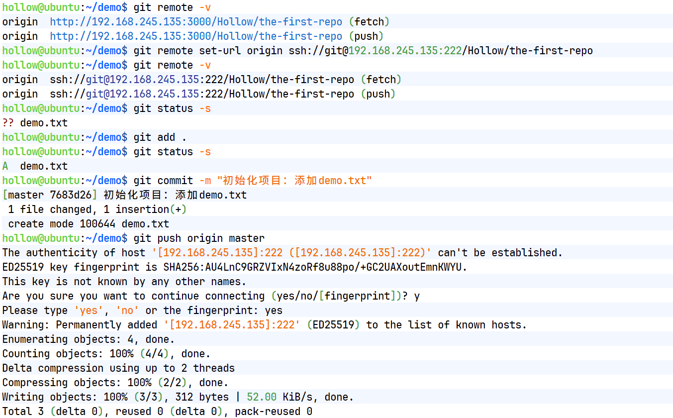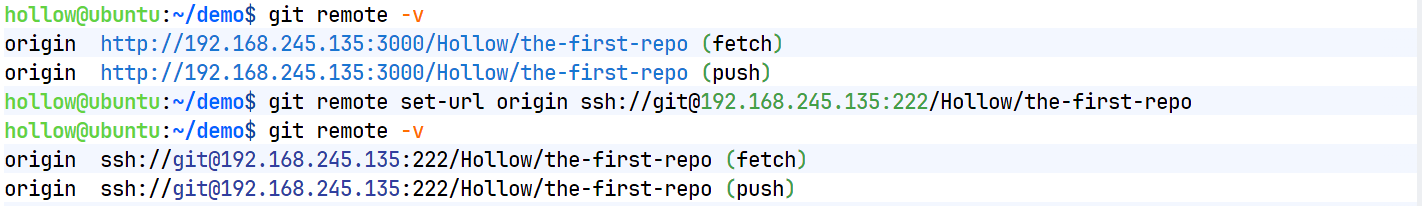 git remote set-url origin ssh://git@你的Gitea域名或IP:端口/用户名/仓库名.git #修改为SSH地址