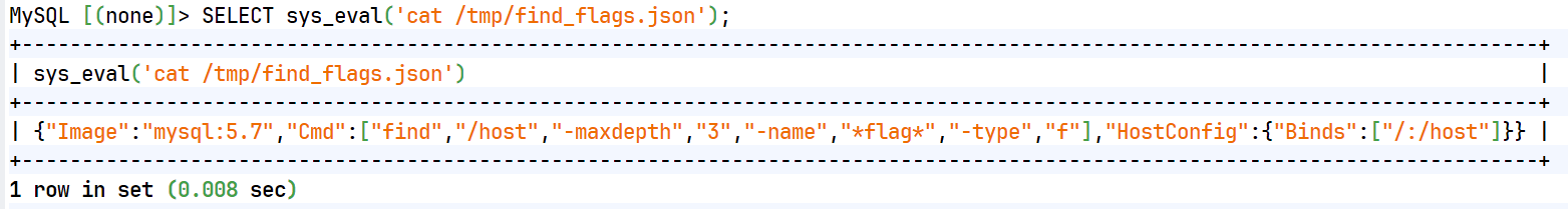 SELECT sys_eval('cat /tmp/dockers_payload.json');"Image": "mysql:5.7" :使用 mysql:5.7 镜像