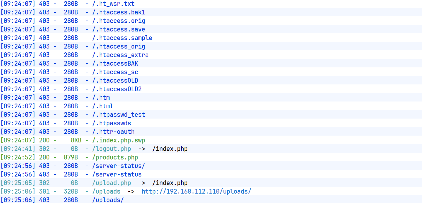 dirsearch -u http://192.168.112.110发现存在.index.php.swp文件,文件上传目录,商品浏览文件,网站首页文件,登录文件