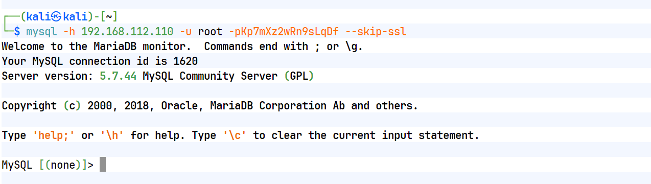 mysql -h 192.168.112.110 -u root -pKp7mXz2wRn9sLqDf --skip-ssl \